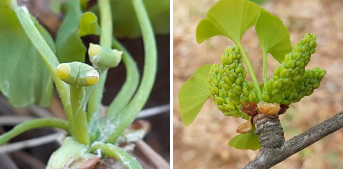 왼쪽이 은행나무 암꽃(열매가 맺히는 부분), 오른쪽이 은행나무 수꽃 - 열매를 맺기 위해 사는 사람과 꽃을 피우기 위해 사는 사람이 있다.