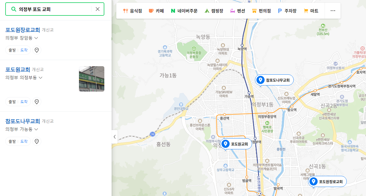 네이버 지도에서 '의정부+포도+교회'로 검색을 해봤습니다.