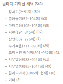 이 블로그의 카테고리는 성경 권별로 분류가 되어 있으며, 성경 권은 실제 방송된 시간 순서로 배치되어 있습니다.